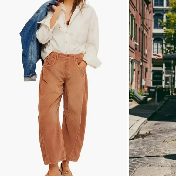 Free People Good Luck Barrel Leg Corduroy PantsStyle No. 90323270; Color Code: Our top-rated Good Luck jeans, now in a textured corduroy fabrication! These barrel jeans from our We The Free collection are featured in a mid-rise fit with wide-legs that taper at the ankle.Fit: Mid-rise, slouchy, relaxed fit, wide-legs, ankle-lengthFeatures: Button closure, textured cord fabrication, belt loops at waistband, 4-pocket style, tapered bottom hem, seam detail throughoutWe The FreeCare/ImportMachine Wash ColdImport