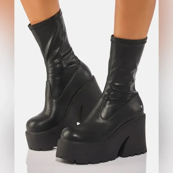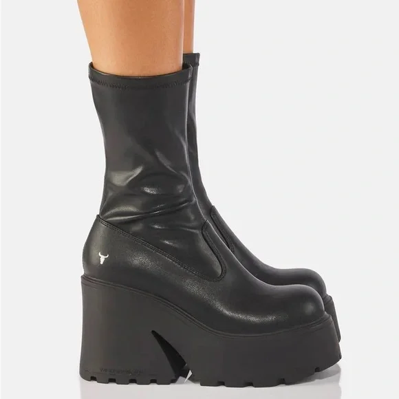 Kleyton Black Boots allyou need is a boost of confidence! These sock booties have a vegan leather construction, stretchy uppers for a slip on fit, rounded toes, and platform soles with flared block heels. If you’re looking for a new boots for this fall/ winter that would make you look pretty but also comfy at the same time, this is the boots for you! Sold out on C/Moran Website. Asking less than retail.