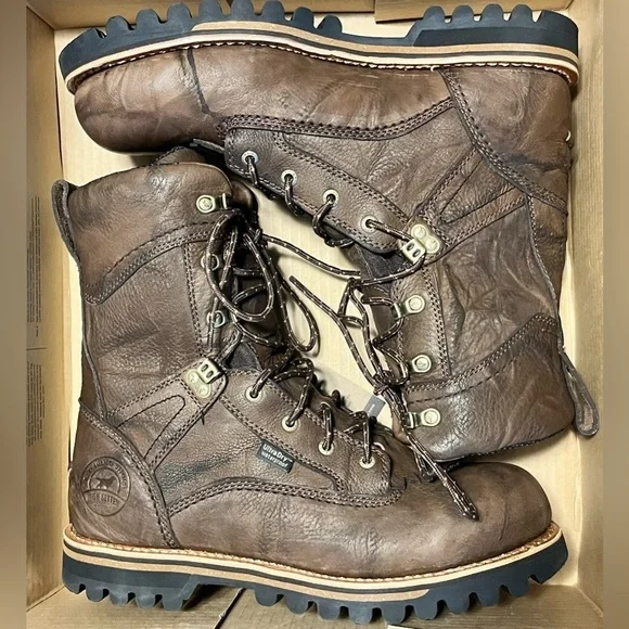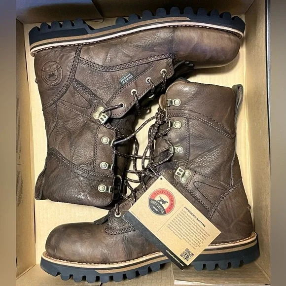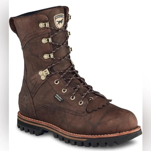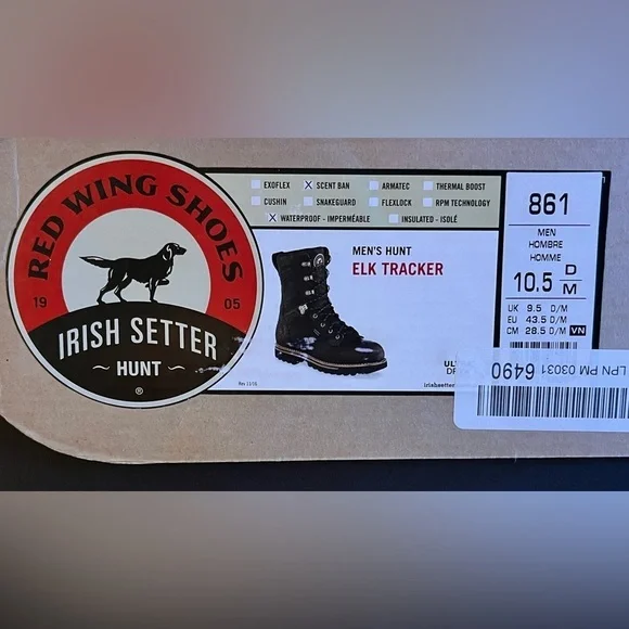 NWT: Red Wing Irish Setter, Elk Tracker, Men’s, 10" Waterproof, Uninsulated, Hunting BootSIZE: 10.5 DCOLOR: BrownPRODUCT DETAILS:FABRIC TYPE:100% LeatherCARE INSTRUCTIONS:Machine WashSOLE MATERIAL:RubberABOUT THIS ITEM:UltraDry WaterproofScentBanBulls-Eye Air Bob Aggressive SoleFull Grain, Waterproof Leather upperDESCRIPTION:This all-leather boot has the durability to handle rugged environments and no insulation for cooler, more comfortable wear during early season hunts. This waterproof boot has cork and eva midsole for added underfoot comfort and the air bob aggressive sole provides superb stability and traction on the toughest terrain.