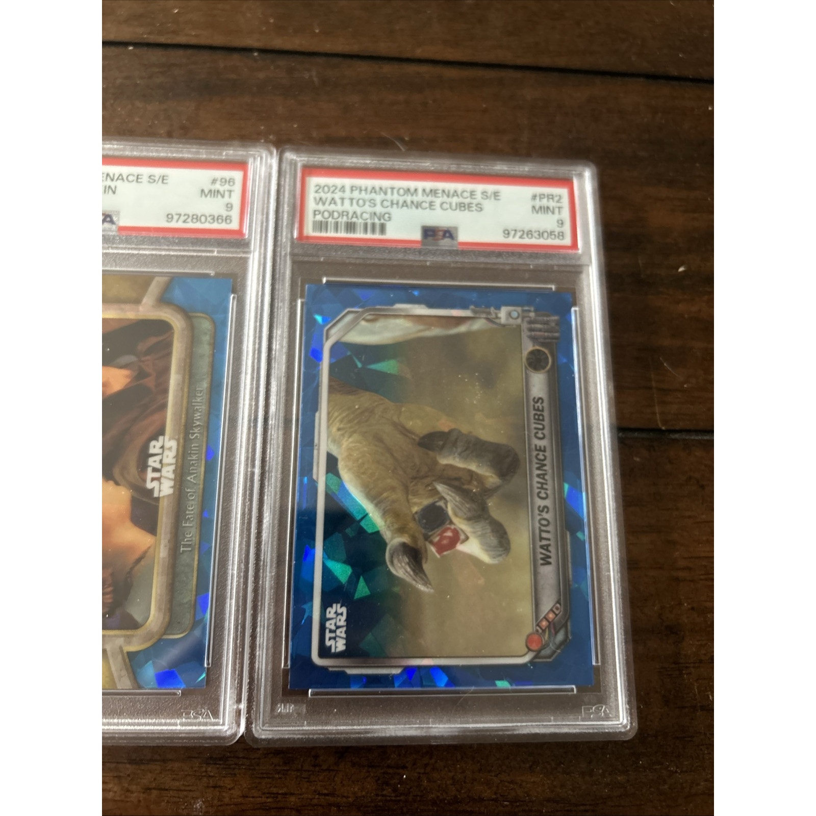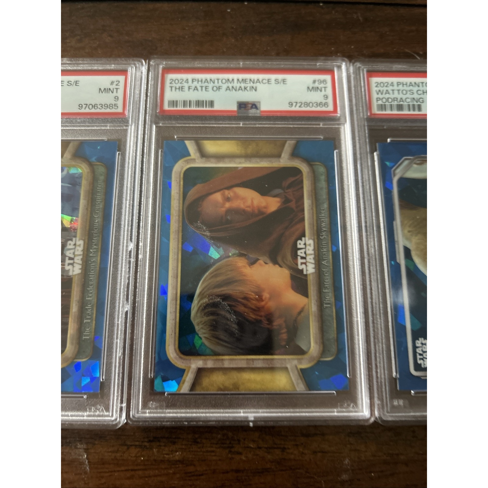 The product is a lot of 3 non-sport trading cards from the 2024 Phantom Menace S/E set featuring the character Anakin Skywalker from "Star Wars: Episode I – The Phantom Menace." The cards are graded PSA 9 and include card numbers 2, 96, and PR2. They are manufactured by Topps as part of a sci-fi genre franchise.
