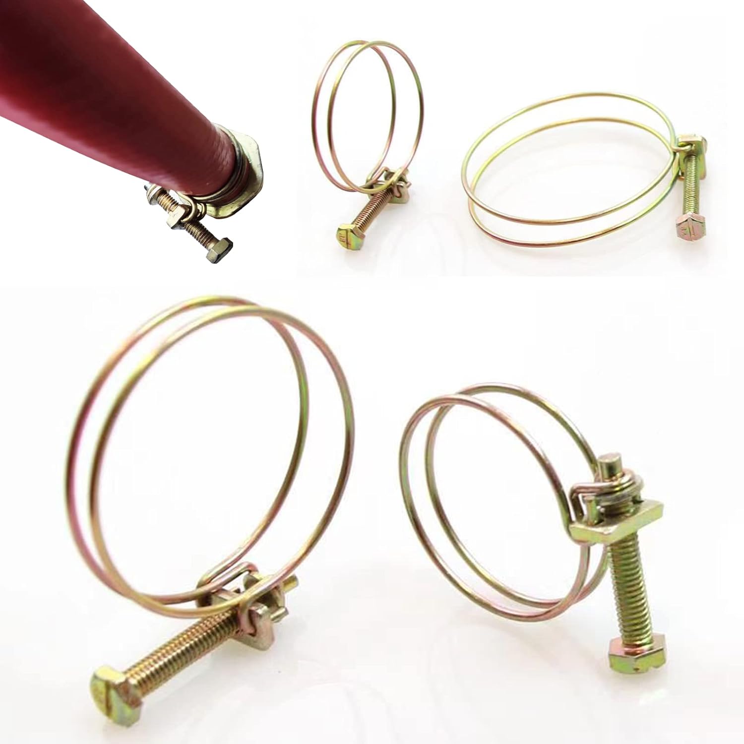 Double Wire Hose Clamp Features 1. Adjustable screws allow for a custom fit to the diameter of the pipe. 2. Double line design provides strong clamping force to prevent hose extrusion. 3. Ideal for use in indoor hot water pipes, air conditioning pipes, petrochemical transport pipelines, and more Package Includes: 10-12mm-----10pcs 13-16mm-----10pcs 16-19mm-----10pcs 18-25mm-----10pcs 25-29mm-----10pcs 25-32mm-----5pcs 34-38mm-----5pcs 48-51mm-----5pcs