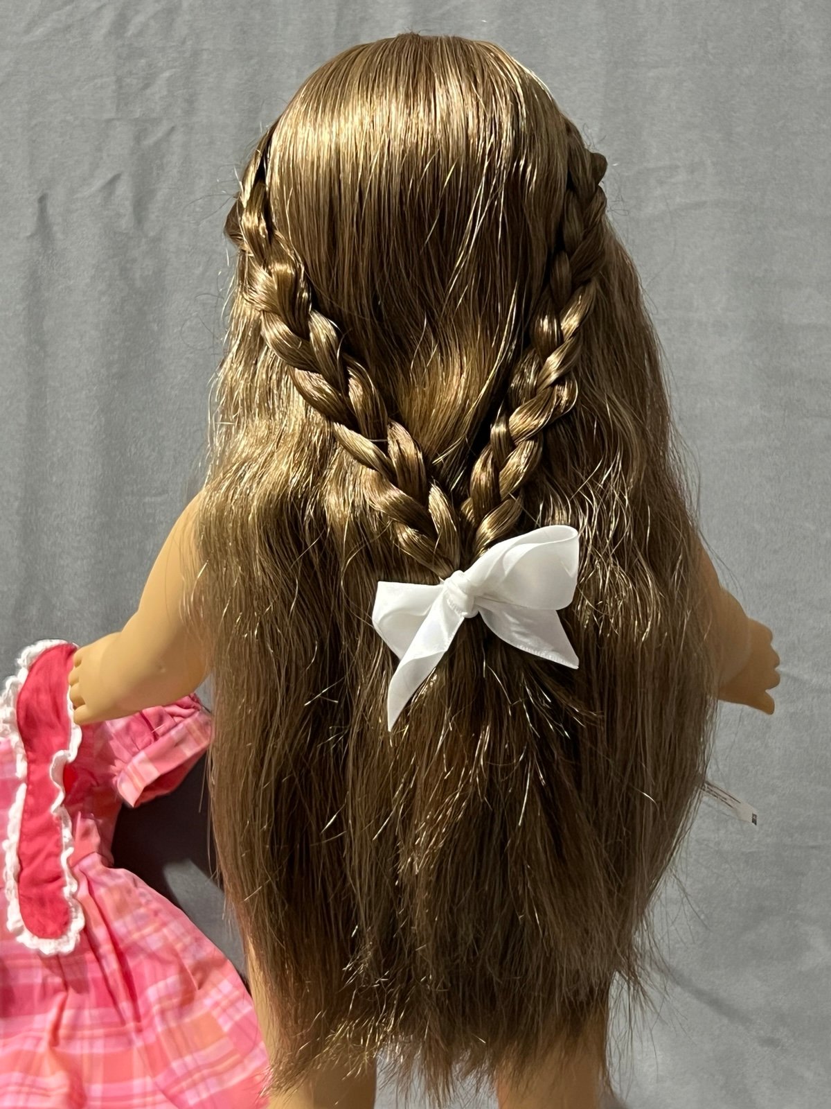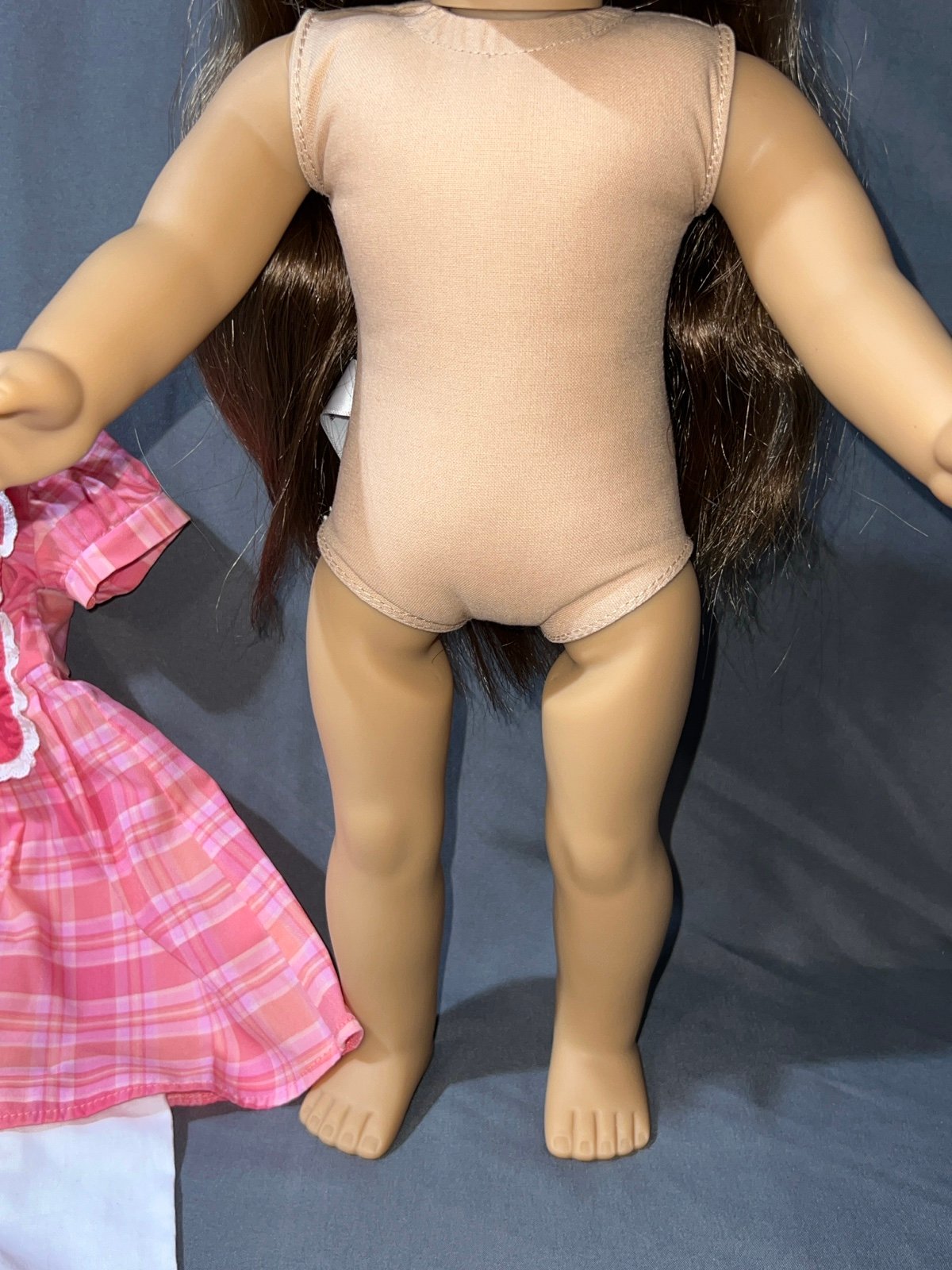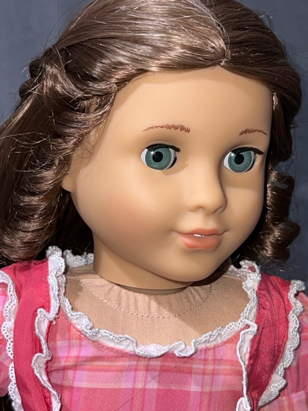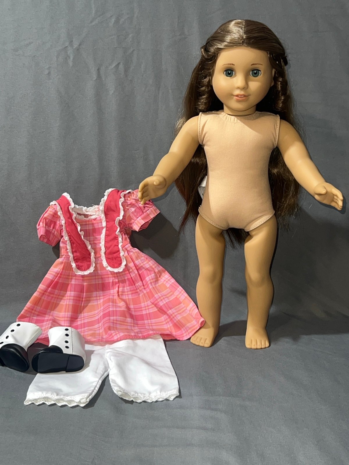 American Girl Doll Marie-Grace in her meet dress, pantaloons and boots. RETIRED. Her hair is soft, she’s in very good and clean conditions. Legs are slightly loose but she stands without assistance, also her eyes open and close.