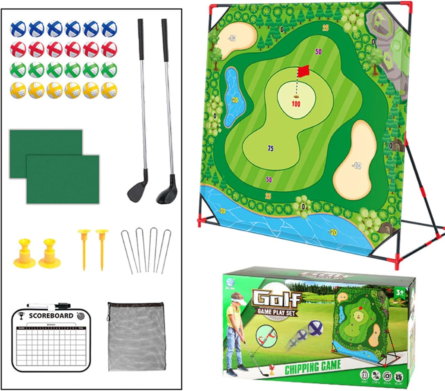 Set Include: 1 Set Golf Chipping Game Condition: New with tags Material: 60% Polyester, 20% Plastic, 20% Metal -Tag No.---|---Recommended Size---|-------Golf Game Practice Stand--- One Size---|-------One Size-------|---53.7x36.2x54.3''/136.5x92x138cm