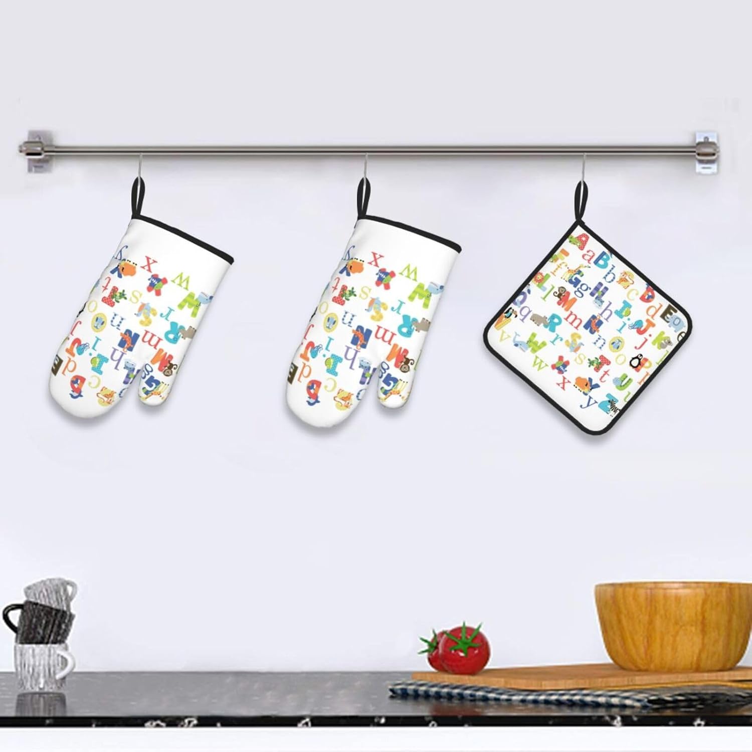 upgrade your kitchen safety with this Colourful Animal Alphabet print microwave gloves, oven mitts and pot holders sets. crafted from water repellency polyester and heat-resistant fabric, these kitchen baking three piece set offers reliable protection for hands while handling hot items. the double-layer waterproof design ensures easy cleaning after use. suitable for various cooking scenarios including microwave ovens, conventional ovens, stovetop cooking, and outdoor grilling. the side hanging rope allows convenient storage when not in use. the thick construction provides excellent heat insulation without compromising dexterity. this unisex kitchen essential combines functionality with practical design for everyday cooking needs. the heat-resistant gloves maintain comfort while offering superior protection against burns. an essential addition to any modern kitchen setup