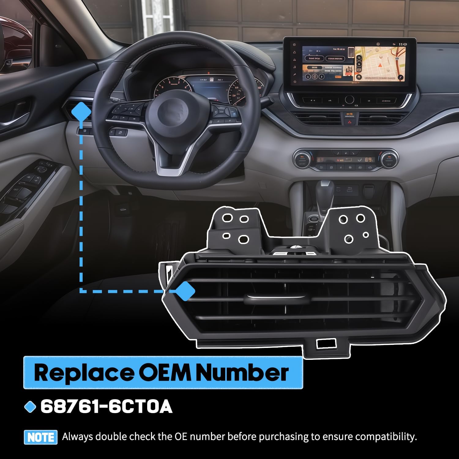 Part Name:Dashboard Air Outlet Brand:PasanguiLocation:Upper center dash trimReplace Part Number:68761-6CT0A Product Material:PlasticColor:BlackWarranty:1 YearFitment:Fit For Nissan Altima 2019Fit For Nissan Altima 2020Fit For Nissan Altima 2021Fit For Nissan Altima 2022Fit For Nissan Altima 2023 Fit For Nissan Altima 2024 Advantage:Premium Material:Made of durable, high-quality plastic that resists wear and aging, ensuring long-lasting performancePrecise Airflow Control:Adjustable blades allow accurate up, down, left, and right movement, letting you control airflow direction and volume with easeOptimized Heating & Cooling:Promotes faster cooling in summer and quicker heating in winter, keeping the cabin comfortable year-roundEnhanced Air Circulation:Well-structured grille improves airflow distribution for smoother, more balanced cabin ventilationHeat & Cold Resistant:Performs reliably under extreme temperatures without cracking, warping, or losing strengthEasy-to-Clean Surface:Smooth, dust-resistant finish prevents buildup and makes cleaning simple, helping maintain efficiency