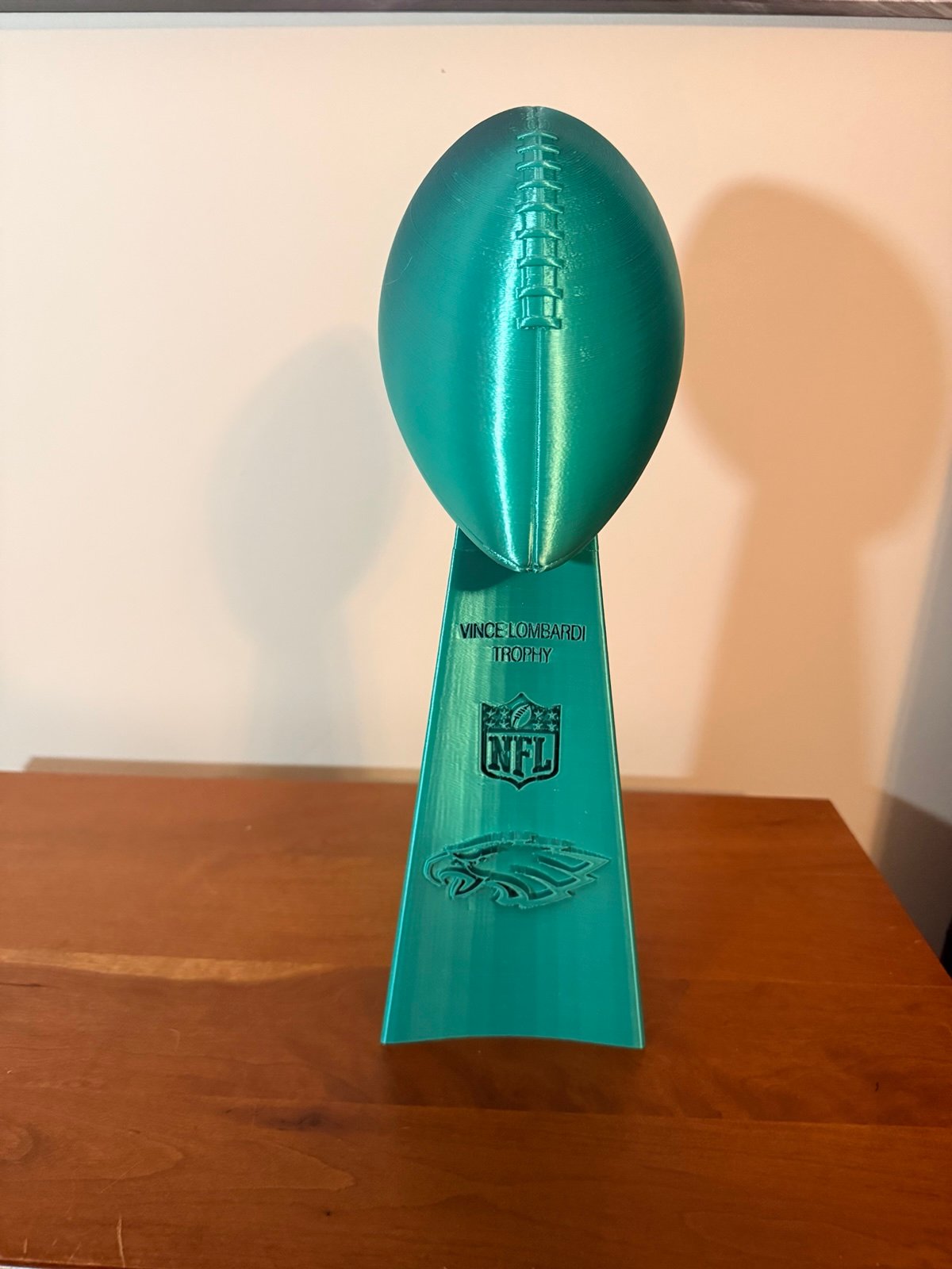 1 Super Bowl trophy with the eagles logo in DUAL green/silver as you turn the trophy the color changes with a green and silver hue GO BIRDS