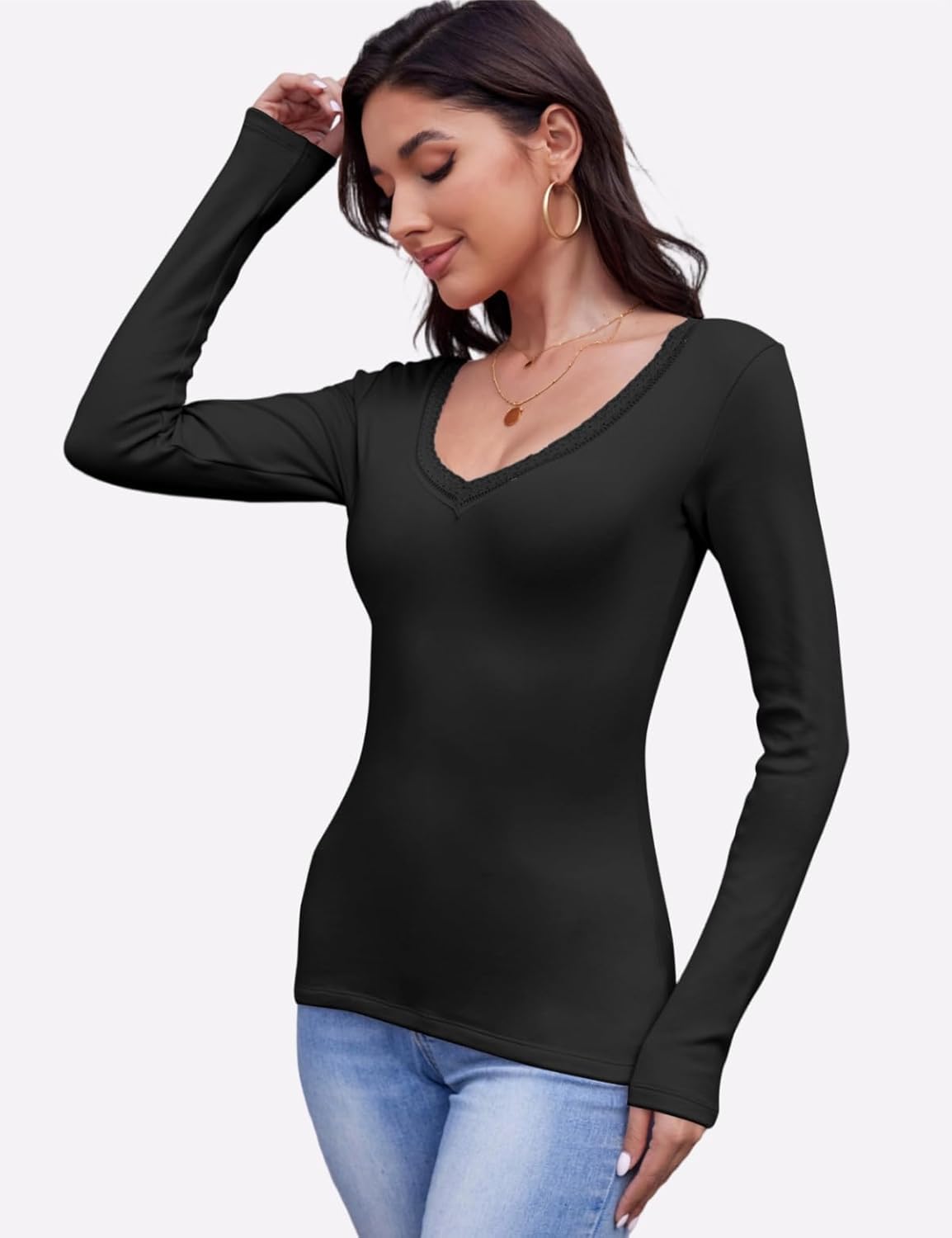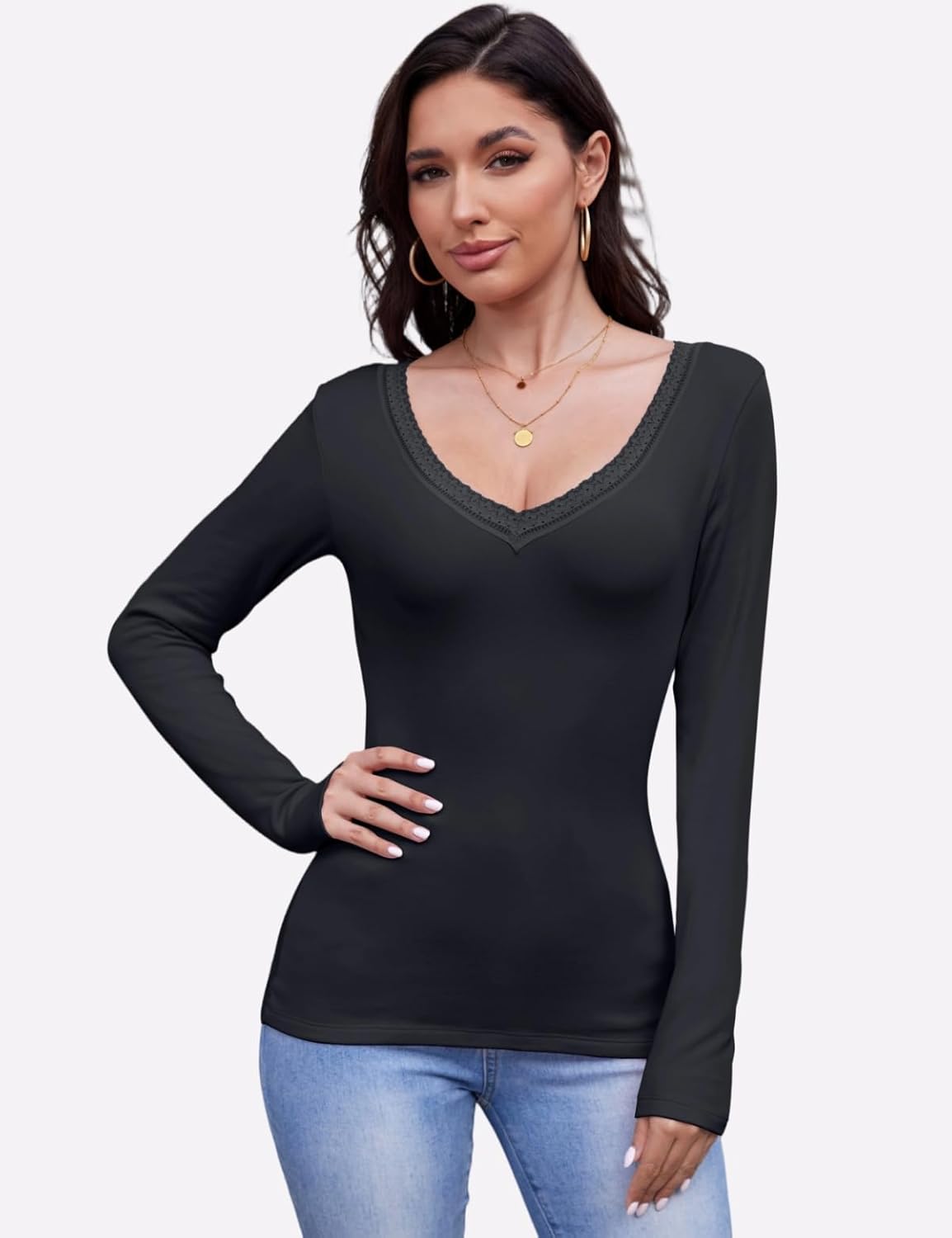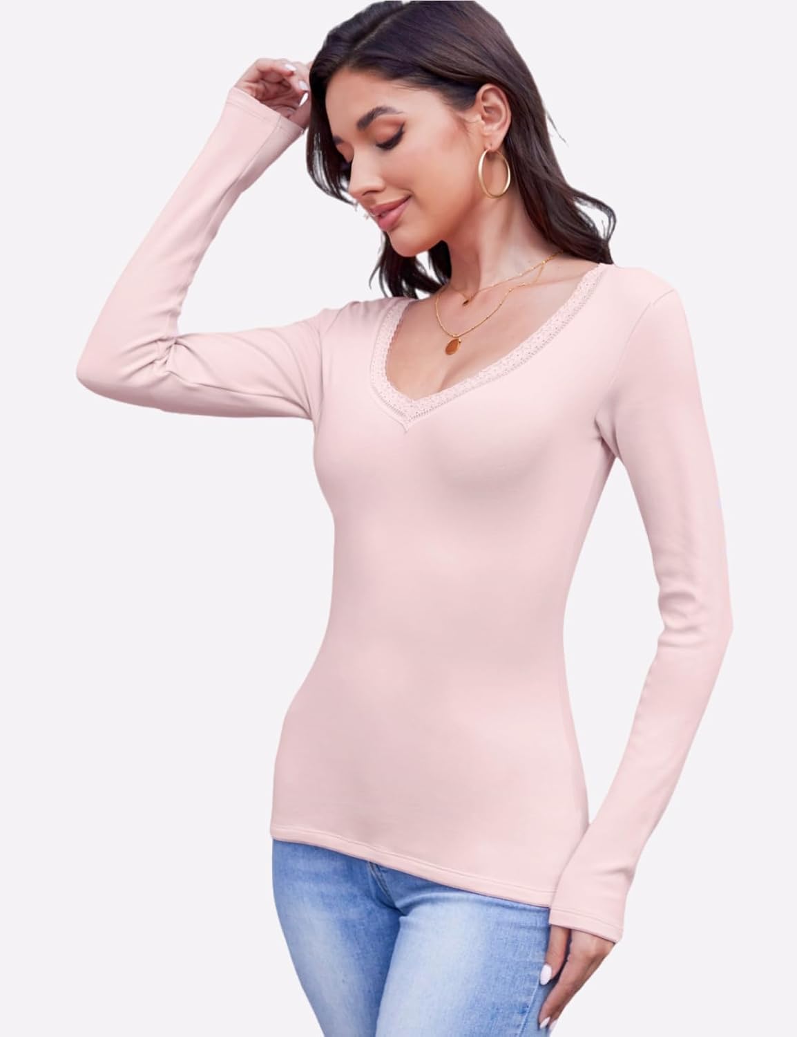 Made from a blend of ninety-two percent cotton and eight percent spandex, this long sleeve shirts for women is designed for comfort, warmth, and gentle stretch that moves with you. The breathable and skin friendly fabric makes the long sleeve shirt for woman good for layering as a thermal undershirt in fall and winter, or wearing on its own for daily style. Featuring a flattering V neck with delicate lace trim and fine stitching, this womens long sleeve tops combines feminine details with everyday practicality. The long sleeve tops for women lies flat under blazers and coats, while also looking chic and casual when paired with jeans, trousers, or skirts. Available in versatile colors including black, white, pink, and blue, with sizes from S to XXL, this thermal underwear for women is made to suit different body types and personal styles. Whether you need a basic layering top for the office or a casual fitted tee for weekend outings, thermal shirts for women adapts easily to multiple wardrobe needs. The design is versatile enough for various occasions: wear it solo for coffee runs, dress it up with trousers for business meetings, or style it with coats for seasonal travel, parties, dates, and relaxed vacations. Customers often choose this type of fitted long sleeve top because the thermal long sleeve women works both as a thermal undershirt for warmth and as a casual layering piece for flexible outfits Easy to care for, this long sleeve lace trim shirt can be machine washed in a laundry bag or hand washed in cold water to protect the fabric and details. Hang to dry naturally to maintain shape and durability.
