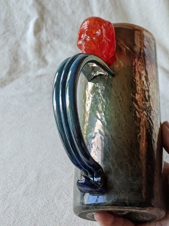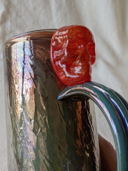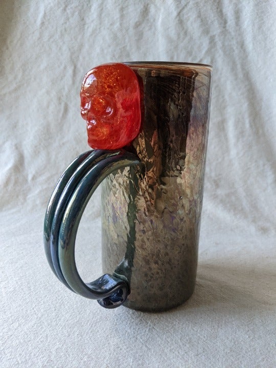 One of a Kind handled art glass tankard mug with red skeleton decoration upper the handle.