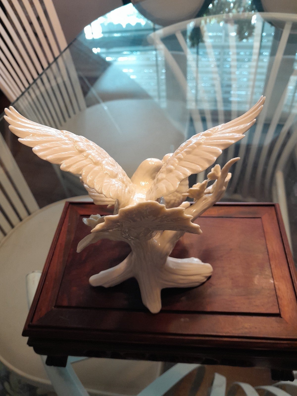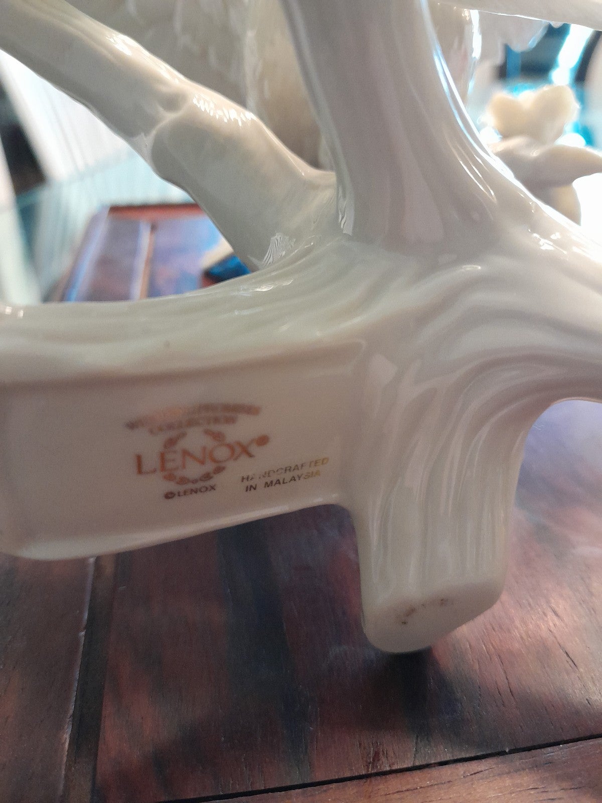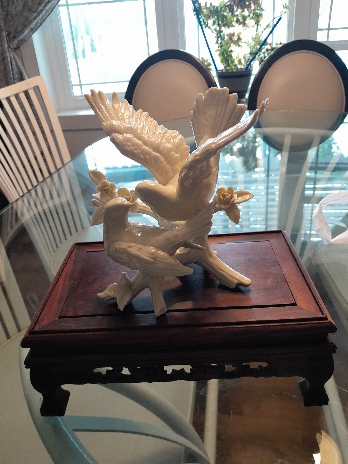 Its a Lennox porcelain statue with two birds sitting on a tree branches with flowers and its sitting on a rosewood stand to show how beautiful this Lennox statue is the statue is 6 1\2 inches high and its 5 1/4 inches wide and the depth is 5 1/2 inches