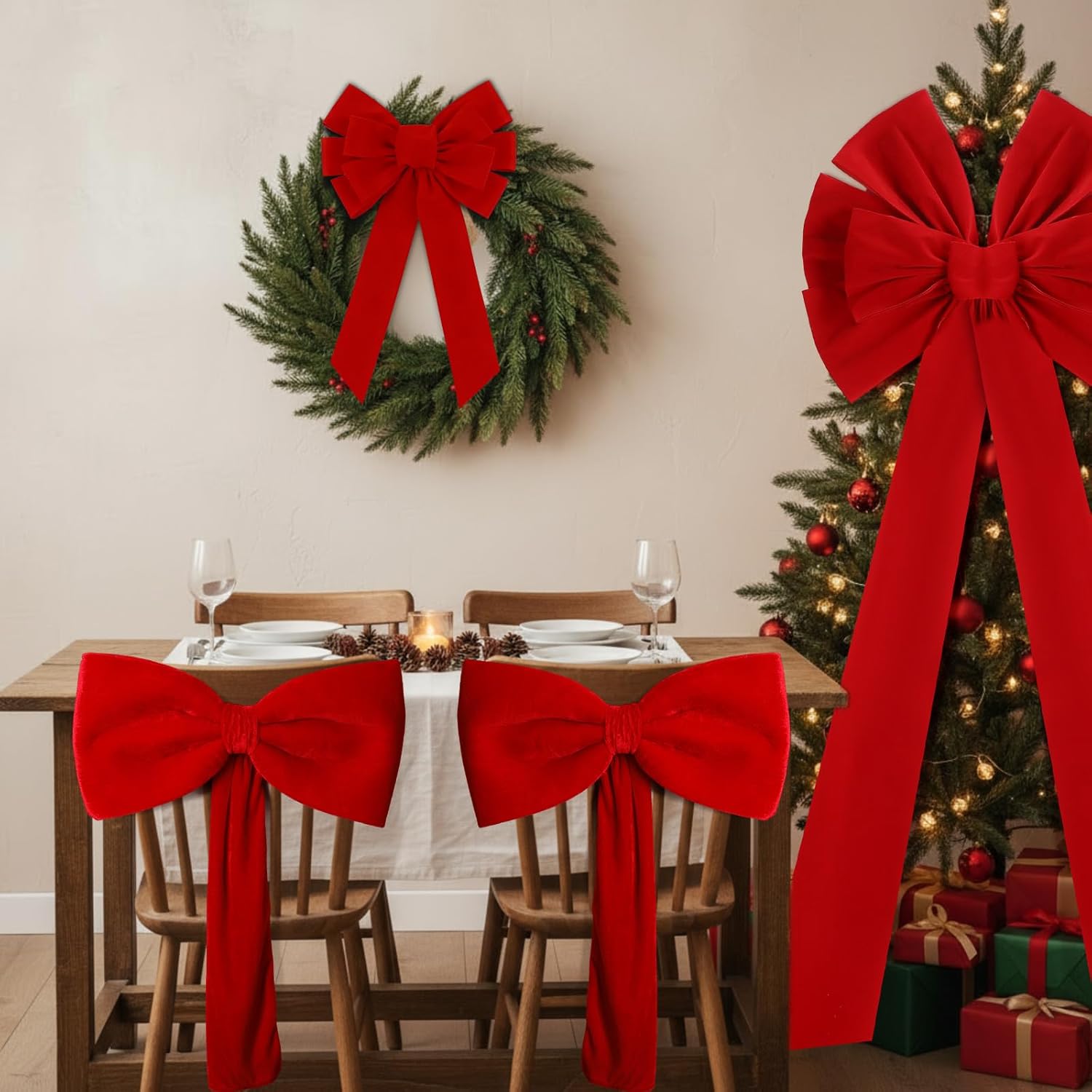 Features: Easy to decorate: Our Christmas velvet bows ideal for all occasions and can be applied indoors/outdoors - decorate tables, the centerpiece, cake, and vases. Wire in back for attaching anywhere! And the bow is also lightweight, which is convenient for you to carry and store. Note: due to packaging reasons, the bow you receive may have slight creases. Please straighten and flatten it by hand after receiving the product, or use an iron to achieve the most nice appearance. Perfect gift idea: This extra-large Christmas bow is very suitable for Christmas gifts. You can directly prepare these beautiful bows as handmade gifts for friend, or use these bows to decorate your holiday gifts and give them to your family, lover, colleagues. It will create a lot of fun and happiness for you and your family and friend. Specifications: Material: velvet Color: red Size: Tree top bow: 19.6 x 70.9 inch / 50 x 180 cm Wreath bow: 11.8 x 19.6 inch / 30 x 50 cm Chair back bows: 17.7 x 29.5 inch / 45 x 75 cm Package includes: 1 x Christmas Tree Topper Bows 1 x Wreath bow 4 x Chair back bows Notes: Manual measurement, please allow slight errors on size. The color may exist a slight difference due to different screen displays
