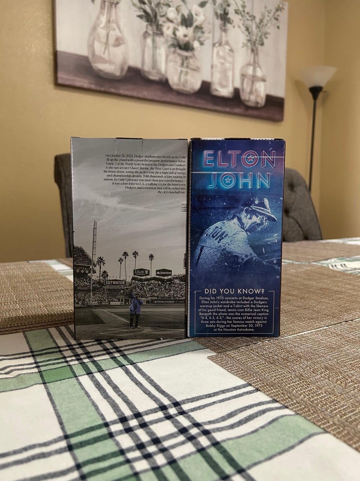 The LA Dodgers "Ice Cube 2025 & Elton John 2022 Bobblehead Set is a unique collectible featuring officially licensed bobbleheads of Ice Cube and Elton John, representing the Los Angeles Dodgers in Major League Baseball.