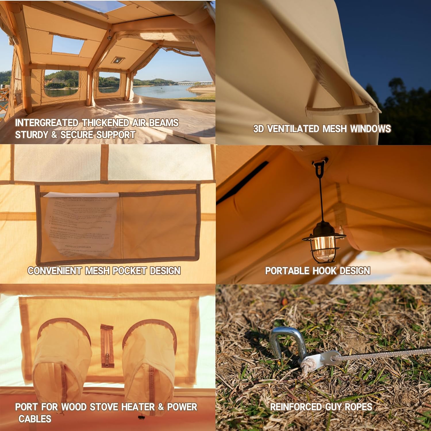 | Assembly Instructions Description | The tent inflates in 10 minutes using the included pump. No poles are required. Simply unfold the tent, connect the pump, and inflate. Once inflated, secure the tent with the provided stakes and guylines. For deflation, release the air valves and fold the tent back into its storage bag. |