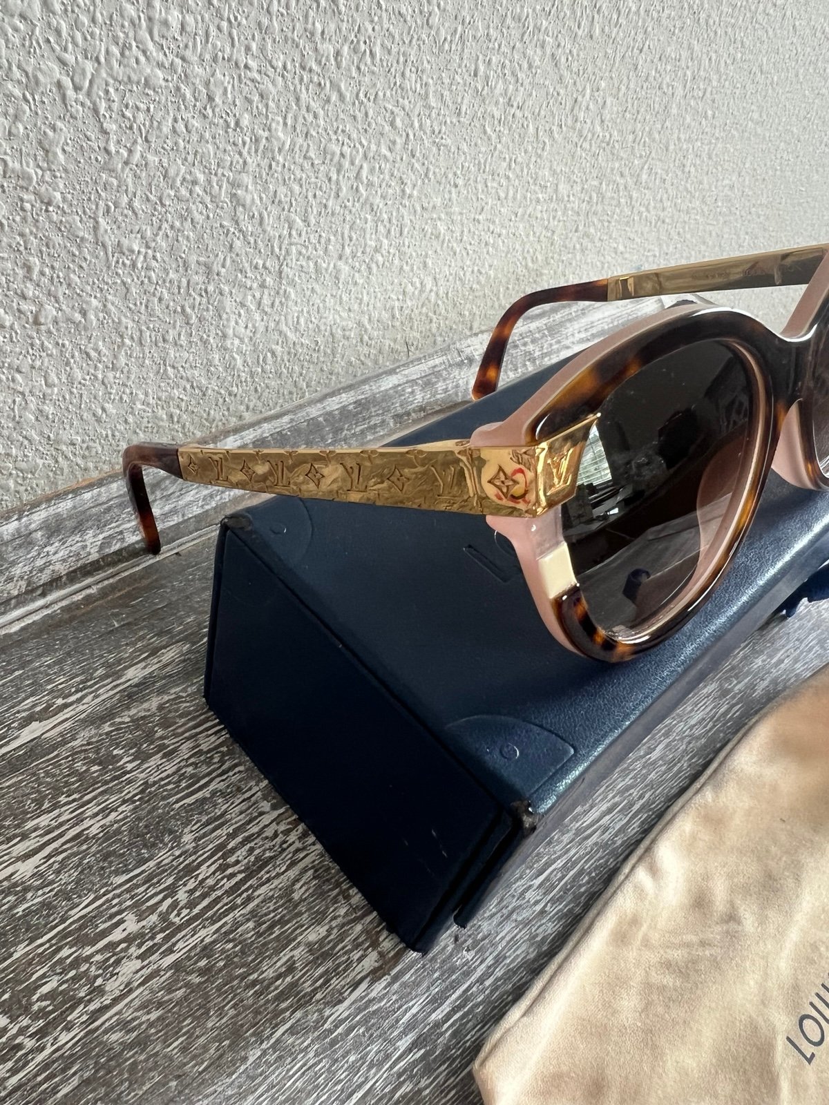 Authentic LV Pettit Soupcon Cat eye sunglasses in good condition. The LV Petit Soupçon Cat Eye sunglasses are comprised of a rich mix of materials. This new take on a best-selling style sees a layered design of solid and glittered acetate that is detailed with polished hardware. LV Initials are meticulously engraved on the front while the temples feature the iconic Monogram pattern.