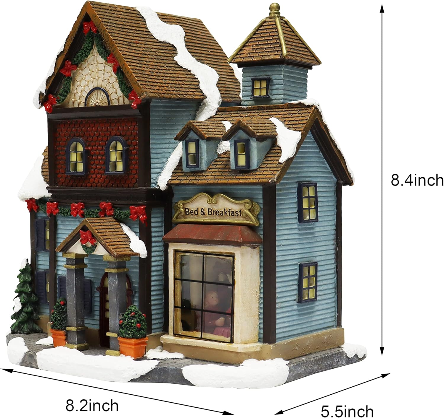 Create a magical holiday scene with the MOMENTS IN TIME Bed & Breakfast Christmas Village Building, a beautifully crafted piece that captures the warmth and nostalgia of the season. This lighted Christmas village house glows softly through its windows, inviting you to imagine cozy winter nights and joyful holiday gatherings. With intricate architecture, realistic snow details, and hand-painted finishes, this LED Christmas decoration brings timeless charm to your holiday décor. Standing at 8.5” H x 8.3” W x 5.5” D, this miniature Christmas house is the perfect centerpiece for your Christmas village display, tabletop, or mantel. The soft LED lights illuminate the detailed Bed & Breakfast interior, creating a heartwarming glow that enhances your holiday home décor. Whether displayed alone or as part of a larger Christmas village collection, this elegant piece instantly transforms your space into a winter wonderland village scene. Designed with convenience in mind, the Bed & Breakfast is battery operated (3 AA batteries not included) giving you flexibility to place it anywhere without cords or outlets. It’s ideal for mantel displays, shelves, side tables, or under the Christmas tree. Crafted from durable materials and lovingly hand-painted, this collectible piece ensures lasting beauty for many holiday seasons to come. The MOMENTS IN TIME Christmas Village Bed & Breakfast makes a thoughtful gift for Christmas lovers, collectors, and anyone who appreciates vintage-style holiday décor. Each piece arrives in gift-ready packaging, making it easy to surprise someone special with a charming light-up Christmas village house that’s ready to display right out of the box. Celebrate the magic of Christmas with this enchanting LED light-up Christmas village building a perfect blend of tradition, craftsmanship, and festive cheer. Add it to your collection today and let your home sparkle with the nostalgic beauty of hand-painted Christmas décor from Moments in Time.