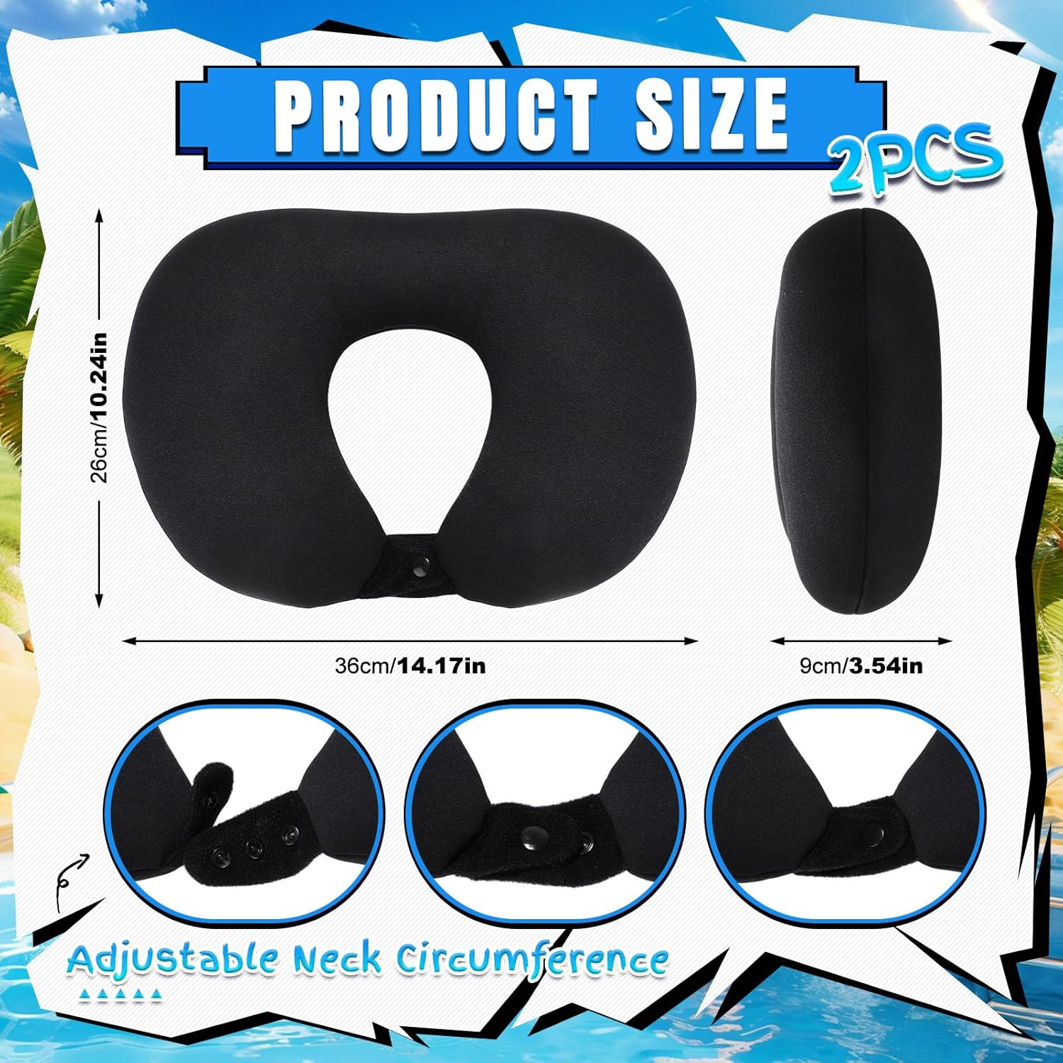 Features: The float swim collar contains foam particles and does not require inflation. Using this aquatic head and neck support pillow keeps your head securely above the water. Specifications: Material: neoprene, EPS foam Color: black Size: approximately 36 x 26 x 9 cm/ 14.2 x 10.2 x 3.5 inches Package includes: 2 x Swimming pool floating neck pillows Notes: Manual measurement, please allow slight errors on size. The color may exist a slight difference due to different screen displays.