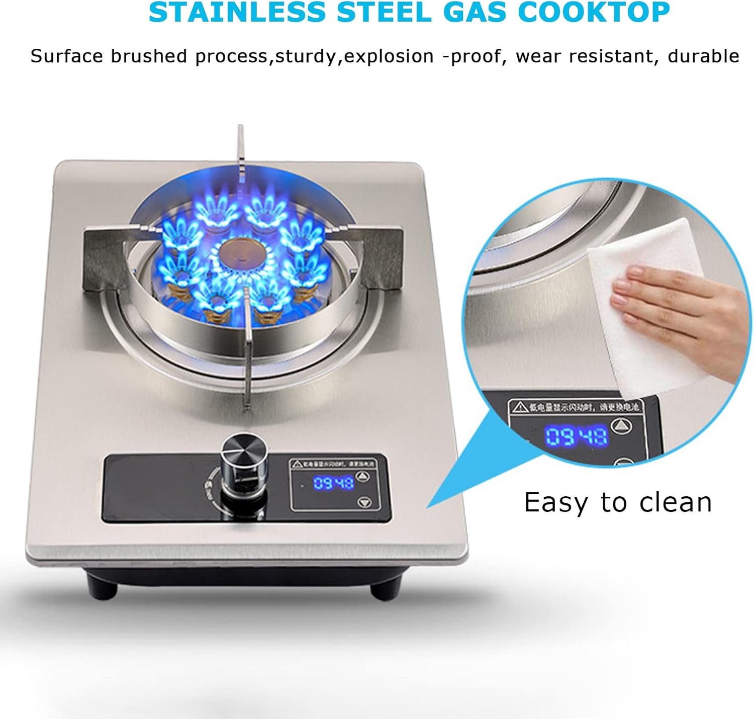 Our Single Burners Gas cooktop is a good helper for your cooking, can easily meet various cooking needs such as simmering, boiling, frying, stir-frying, steaming, melting,etc.is the best choice for your Family gathering, BBQ, Travel, Emergency preparation. Let your family and friends enjoy a good life. SPECIFICATIONS Material: stainless steel Control Type: Knob Control Panel Size: 43x32cm,Cut hole size 38x27cm Installation Type: Drop-in/tabletop FEATURES 1.Brushed stainless steel Gas stove, sturdy,high temperature resistance, easy to clean. 2.90 minute Timer,when the timing is over,automatic fire off 3.Knob control, different ingredients correspond to different heat, easy to control the key to delicious 4.Thermocouple flameout device will shutoff the gas automatically if a flame is not detected to ensure your safety in an emergency. PACKAGE INCLUDING 1 x Gas Cooktop,1 x Operation Instruction NOTES 1. When buying a gas stove, pay attention to natural gas/liquefied gas (not included) and hole size。 2.We Suggest you to ask for a professional to install it.Please check the manual guide before using your gas hob. 3.Due to manual measurement, there may be an error of 2-3cm. Hope your understanding. If you have any questions, please contact our team in time, we will try our best to solve the problem for you and make you satisfied.