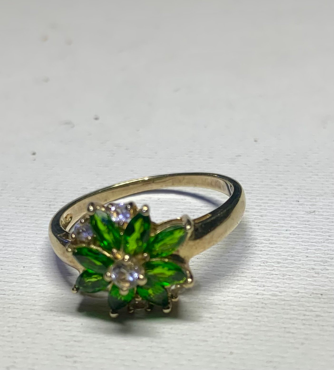 A stunning vintage floral statement ring featuring vivid green marquise-cut stones arranged in a beautiful layered flower design. The center cluster is accented with clear sparkling stones for added brilliance. Marked 10K inside the band.