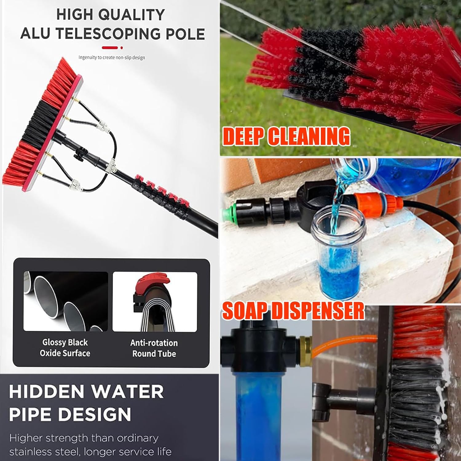 3.6 ~ 6 Meter Water Fed Pole Kit,Outdoor Window Glass Solar Panel Cleaning Brush,Extendable Extendable Telescopic Pole Water Fed Brush FEATURES - Widely Application: The water fed pole kit is perfect for cleaning or washing Solar Panels, Windows,Conservatory roof,House Siding, Auto Cars, Trucks, SUV, RV, Boats, Driveways, Decks, Floors, Patios,Bathrooms,Snow Removal and more! You can do your hard-to-reach tasks above the ground without worries about falling off your ladder - Lightweight Cleaning Pole: The water fed cleaning pole is made of sturdy lightweight aluminum,easy to carry.Nonslip soft sponge-covered handle make it more comfortable to use; Its telescopic handle allows adjusting the broom's length as you clean - Efficient Cleaning: There are 4 holes at the brush head for water outlet. The powerful water outlets,silicone scraper and soap dispenser can quickly clean surface dirt - 180° Rotatable Brush Head: The water fed brush is designed with soft PP bristles and 180° rotatable brush head,you can clean various angled surfaces from the ground - Easy to Installation and Connect: Simple operation. It's a fully extendable water fed pole washing system;can be connected to your pure water system or to garden hose PRODUCT PARAMETERS: Water hose: 8M Brush width: 35CM/55CM Squeegee length: 35CM Specifications: 3.6M, 4.6M, 6M window cleaning water fed poles roof window cleaning equipment water fed window cleaning kit telescopic window cleaner cleaning tool telescopic brush window cleaning brush window cleaner extendable telescopic roof window cleaner window washing pole conservatory roof cleaner brush caravan cleaning brush extendable window cleaning pole gutter cleaner telescopic mossIngredients aluminium Ingredients